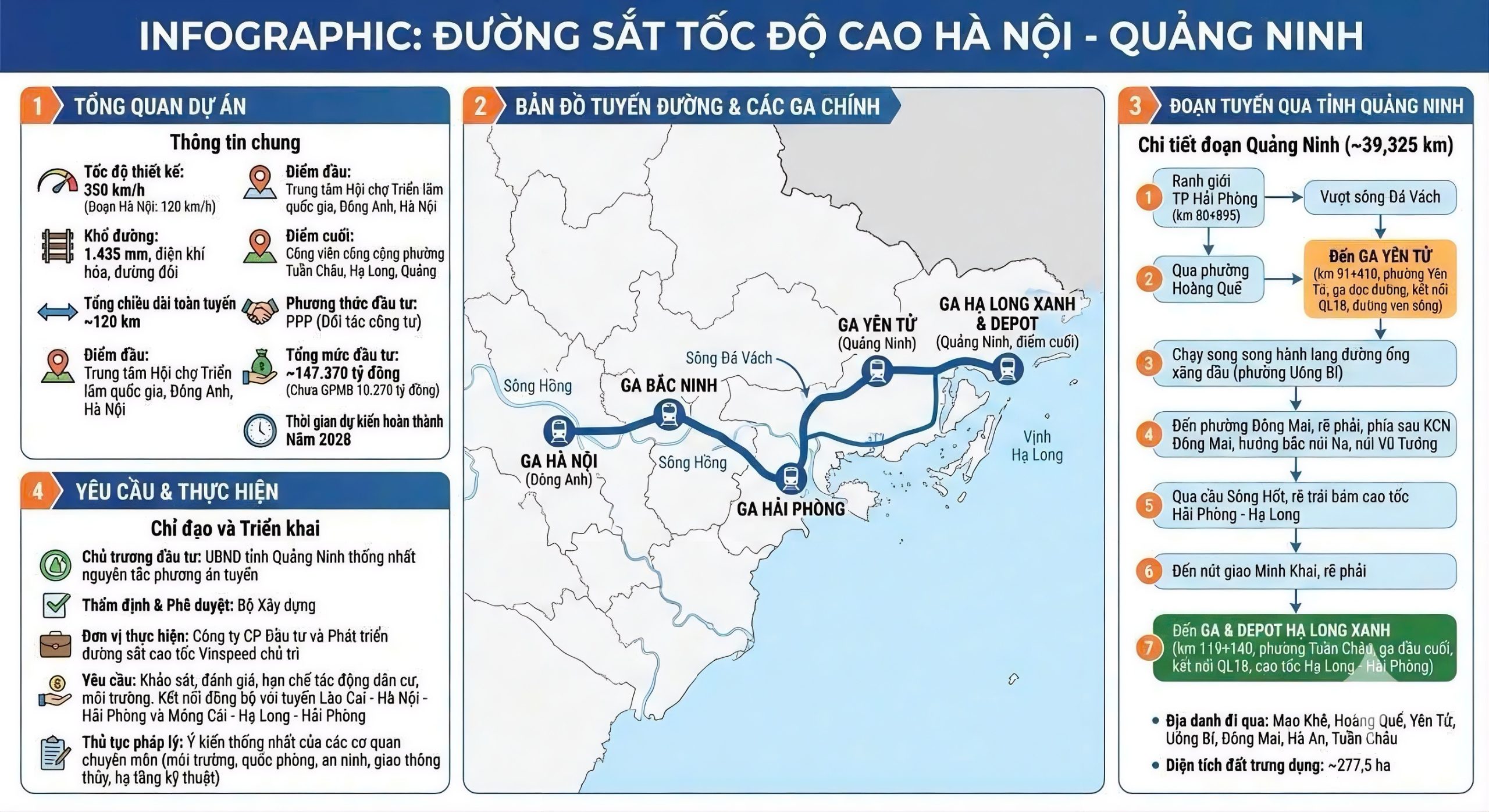 Tuyến đường sắt dài 120,4km với khổ đường 1.435mm, điện khí hóa, tốc độ thiết kế tối đa 350km/h sẽ rút ngắn thời gian di chuyển từ Hà Nội về Quảng Ninh xuống chỉ còn khoảng 30 phút. Ga Hạ Long tại phường Tuần Châu được bố trí với diện tích 1,26ha, thiết kế 4 đường ray, kết nối trực tiếp với Quốc lộ 18 và cao tốc Hải Phòng – Móng Cái.